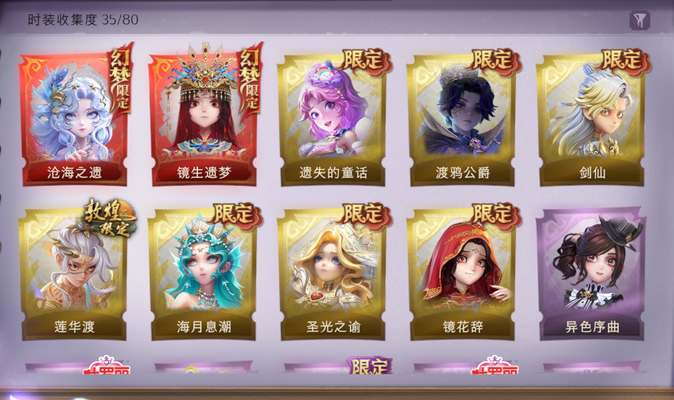 装备描述:;皮肤:薇薇安-沧海之遗,巫铃儿-镜生遗梦,逍遥-莲华渡,薇薇安-圣光之谕,巫铃儿-镜花辞,薇薇安-海月息潮,零-渡鸦公爵,小黄-遗失的童话,逍遥-剑仙,零-青云逸歌,阿念-庆宴绮愿,薇薇安-仙锋小姐,阿念-迷途僵宝,小黄-罗丽,薇薇安-白光莹,小黄-呱呱雨衣,零-搬开山,爱丽丝-丝缕哀歌,艾伦-水王子,巫铃儿-素影瑶光,艾伦-黎明猎手,小黄-异色序曲,阿念-王子与骑士,逍遥-绣春逍影,莉莉-除妖小师妹,爱丽丝-耀眼的你,爱丽丝-冰公主,莉莉-情公主;主页装扮:主页装扮-虚镜回廊,主页装扮-聚宝龙龛、喷气背包-晶澜灵翼,桃木剑-寂潮之刃,折扇-露露扇,电击枪-权杖的许诺,音响-月光奏鸣曲,急救包-末章心跳,腰包-宝剑八,转轮手枪-新星时代,专业手电-云端梦想计划,传送按钮-逆时审判,桃木剑-最后的独角兽,摸金符-海洋之心,额外的背包-飞花令,夜视仪-敛花容,腰包-红运福虎,刺刀-小鲨匕首,急救包-蔷薇物语,喷气背包-乘风溯雪,除颤仪-弦外之音,刺刀-紫气东来,黄牛能量饮料-青玉抱丹,摸金符-祝祷词,音响-happy猫,除颤仪-冰晶般的代价,长鞭-缚誓之锁,长鞭-新春炸响,刺刀-碧络琅环