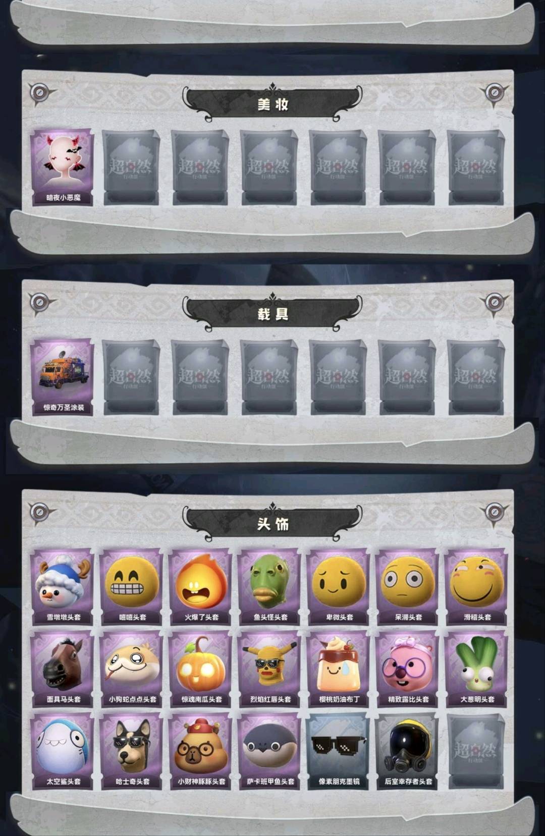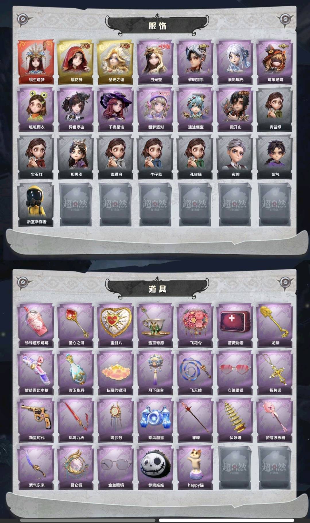 装备描述:红皮1;金皮2;紫皮10;道具皮26;皮肤:巫铃儿-镜生遗梦,巫铃儿-镜花辞,薇薇安-圣光之谕,薇薇安-白光莹,艾伦-黎明猎手,巫铃儿-素影瑶光,莉莉-莓果陷阱,小黄-呱呱雨衣,小黄-异色序曲,兰-千夜星谕,爱丽丝-甜梦派对,阿念-迷途僵宝,零-搬开山;道具:黄牛能量饮料-珍珠芭乐莓莓,铲子-圣心之泪,腰包-宝剑八,黄牛能量饮料-雪顶奇愿,额外的背包-飞花令,急救包-蔷薇物语,铲子-龙鳞,短管猎枪-赞萌露比水枪,黄牛能量饮料-青玉抱丹,腰包-私藏的银河,腰包-月下莲台,长鞭-飞天绫,夜视仪-心跳眼镜,摸金符-祝祷词,转轮手枪-新星时代,桃木剑-凤鸣九天,音响-鸣沙鼓,喷气背包-乘风溯雪,长枪-罪棘,葫芦-伏妖塔,铲子-赞萌波板糖,刺刀-紫气东来,传送按钮-昆仑镜,夜视仪-金丝眼镜,腰包-惊魂娃娃,音响-happy猫;美妆:美妆-暗夜小恶魔;饰品:头饰-雪墩墩头套,头饰-嘻嘻头套,头饰-火爆了头套,头饰-鱼头怪头套,头饰-卑微头套,头饰-呆滞头套,头饰-滑稽头套,头饰-面具马头套,头饰-小狗蛇点点头套,头饰-惊魂南瓜头套,头饰-烈焰红唇头套,头饰-樱桃奶油布丁,头饰-精致露比头套,头饰-