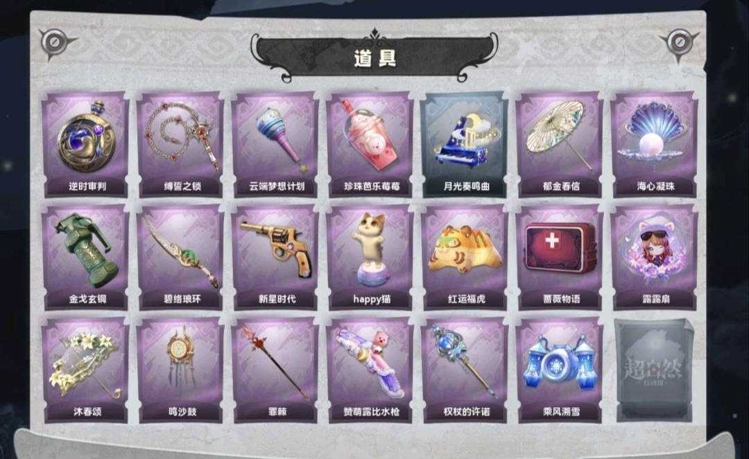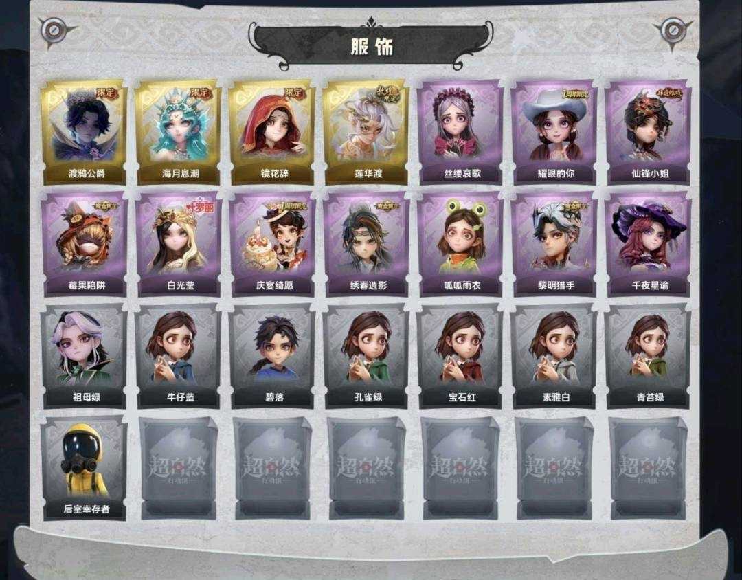 装备描述:金皮4;紫皮10;道具皮20;皮肤:零-渡鸦公爵,薇薇安-海月息潮,巫铃儿-镜花辞,逍遥-莲华渡,爱丽丝-丝缕哀歌,爱丽丝-耀眼的你,薇薇安-仙锋小姐,莉莉-莓果陷阱,薇薇安-白光莹,阿念-庆宴绮愿,逍遥-绣春逍影,小黄-呱呱雨衣,艾伦-黎明猎手,兰-千夜星谕;道具:传送按钮-逆时审判,长鞭-缚誓之锁,专业手电-云端梦想计划,黄牛能量饮料-珍珠芭乐莓莓,音响-月光奏鸣曲,伞-郁金春信,葫芦-海心凝珠,闪光弹-金戈玄铜,刺刀-碧络琅环,转轮手枪-新星时代,音响-happy猫,腰包-红运福虎,急救包-蔷薇物语,折扇-露露扇,伞-沐春颂,音响-鸣沙鼓,长枪-罪棘,短管猎枪-赞萌露比水枪,电击枪-权杖的许诺,喷气背包-乘风溯雪;美妆:美妆-萌兔气泡;饰品:头饰-面具马头套,头饰-卑微头套,头饰-鱼头怪头套,头饰-雪墩墩头套,头饰-呆滞头套,头饰-萨卡班甲鱼头套,头饰-樱桃奶油布丁,头饰-小财神豚豚头套,头饰-烈焰红唇头套,头饰-惊魂南瓜头套,头饰-太空鲨头套,头饰-蒜了八,头饰-火爆了头套,头饰-精致露比头套,头饰-园丁鲨鲨头套,头饰-马上有钱,头饰-滑稽头套,头饰-大葱明头套,头饰-哈士奇头