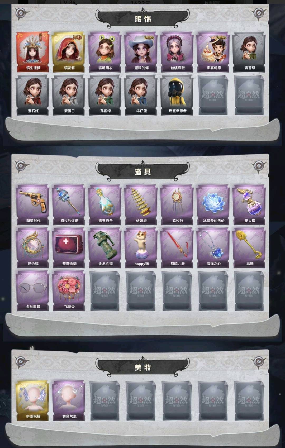 装备描述:红皮1;金皮1;紫皮4;道具皮16;皮肤:巫铃儿-镜生遗梦,巫铃儿-镜花辞,小黄-呱呱雨衣,爱丽丝-耀眼的你,爱丽丝-丝缕哀歌,阿念-庆宴绮愿;道具:转轮手枪-新星时代,电击枪-权杖的许诺,黄牛能量饮料-青玉抱丹,葫芦-伏妖塔,音响-鸣沙鼓,除颤仪-冰晶般的代价,黄牛能量饮料-无人岸,传送按钮-昆仑镜,急救包-蔷薇物语,闪光弹-金戈玄铜,音响-happy猫,桃木剑-凤鸣九天,摸金符-海洋之心,铲子-龙鳞,夜视仪-金丝眼镜,额外的背包-飞花令;美妆:美妆-听潮祝福,美妆-萌兔气泡;饰品:头饰-蒜了八,头饰-芝麻糊汤圆,头饰-嘻嘻头套,头饰-马上有钱,头饰-火爆了头套,头饰-炙热烧烤,头饰-鱼头怪头套,头饰-萨卡班甲鱼头套,头饰-呆滞头套,头饰-烈焰红唇头套,头饰-滑稽头套,头饰-,头饰-卑微头套,头饰-哈士奇头套,头饰-面具马头套,头饰-像素朋克墨镜,头饰-后室幸存者头套,挂饰-孤独对望,挂饰-钗头凤,背饰-牛啤背包,背饰-夜浮船,背饰-蝶恋花;动作:动作-luvaboy,动作-舞台中心,动作-新年摇,动作-sugar摇,动作-鹏友摇,动作-要糖,动作-拜年,动作-抬手,动作-举