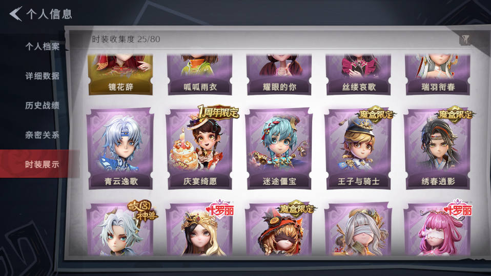 装备描述:巫铃儿-镜花辞,莉莉-莓果陷阱,逍遥-泽引山海,爱丽丝-耀眼的你,薇薇安-白光莹,零-青云逸歌,逍遥-绣春逍影,莉莉-除妖小师妹,莉莉-情公主,爱丽丝-丝缕哀歌,爱丽丝-瑞羽衔春,小黄-呱呱雨衣,阿念-迷途僵宝,阿念-庆宴绮愿,阿念-王子与骑士;道具:短管猎枪-星光的裁决,长鞭-小狗蛇点点鞭,音响-happy猫,黄牛能量饮料-青玉抱丹,急救包-蔷薇物语,刺刀-碧络琅环,长枪-罪棘,额外的背包-灵感泉之花,急救包-末章心跳,伞-郁金春信,电击枪-甜蜜泡泡枪,夜视仪-敛花容,桃木剑-最后的独角兽,铲子-圣心之泪,音响-鸣沙鼓,转轮手枪-新星时代,额外的背包-飞花令,铲子-龙鳞,专业手电-花束般的告白,夜视仪-金丝眼镜,闪光弹-金戈玄铜,摸金符-祝祷词;美妆:美妆-听潮祝福;饰品:头饰-小财神豚豚头套,头饰-马上有钱,头饰-惊魂南瓜头套,头饰-蒜了八,头饰-萨卡班甲鱼头套,头饰-嘻嘻头套,头饰-炙热烧烤,头饰-雪墩墩头套,头饰-小狗蛇点点头套,头饰-樱桃奶油布丁,头饰-呆滞头套,头饰-芝麻糊汤圆,头饰-饺饺者头套,头饰-滑稽头套,头饰-面具