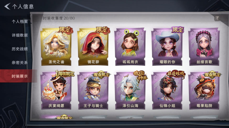 装备描述:巫铃儿-镜花辞,薇薇安-圣光之谕,爱丽丝-丝缕哀歌,爱丽丝-耀眼的你,艾伦-黎明猎手,莉莉-莓果陷阱,小黄-呱呱雨衣,薇薇安-仙锋小姐,逍遥-泽引山海,阿念-庆宴绮愿,阿念-王子与骑士;道具:音响-happy猫,桃木剑-小羊波德莱尔剑,葫芦-海心凝珠,除颤仪-冰晶般的代价,转轮手枪-新星时代,短管猎枪-星光的裁决,急救包-蔷薇物语,摸金符-花落精绝,音响-鸣沙鼓,长枪-糖葫芦霸王枪,专业手电-花束般的告白,夜视仪-金丝眼镜,闪光弹-金戈玄铜,长枪-罪棘,长鞭-缚誓之锁,喷气背包-乘风溯雪,长鞭-新春炸响,黄牛能量饮料-珍珠芭乐莓莓,伞-郁金春信,腰包-红运福虎,传送按钮-浮生一梦;饰品:头饰-芝麻糊汤圆,头饰-大葱明头套,头饰-小狗蛇点点头套,头饰-炙热烧烤,头饰-惊魂南瓜头套,头饰-呆滞头套,头饰-鱼头怪头套,头饰-蒜了八,头饰-卑微头套,头饰-哈士奇头套,头饰-鳄霸天头套,头饰-马上有钱,头饰-萨卡班甲鱼头套,头饰-青团糯糯,头饰-烈焰红唇头套,头饰-面具马头套,头饰-驼半仙头套,头饰-精致露比头套,头饰-火爆了头套,头饰-雪墩墩头