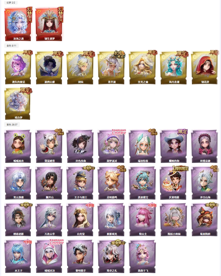 ✨满图鉴✨晶澜灵翼✨2红8金26紫✨非遗皮沧海之遗✨剑仙✨莲华渡✨瑶台梦✨泽引山海✨绣春逍影✨