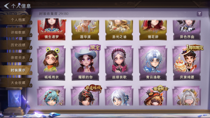 装备描述:巫铃儿-镜生遗梦,薇薇安-圣光之谕,巫铃儿-镜花辞,逍遥-莲华渡,爱丽丝-丝缕哀歌,阿念-庆宴绮愿,小黄-异色序曲,爱丽丝-耀眼的你,巫铃儿-素影瑶光,薇薇安-仙锋小姐,小黄-呱呱雨衣,莉莉-莓果陷阱,莉莉-除妖小师妹,阿念-迷途僵宝,零-青云逸歌;道具:音响-鸣沙鼓,夜视仪-金丝眼镜,腰包-宝剑八,腰包-月下莲台,额外的背包-飞花令,铲子-赞萌波板糖,刺刀-紫气东来,电击枪-甜蜜泡泡枪,短管猎枪-赞萌露比水枪,黄牛能量饮料-青玉抱丹,闪光弹-金戈玄铜,除颤仪-弦外之音,长枪-罪棘,铲子-圣心之泪,伞-郁金春信,摸金符-祝祷词,桃木剑-凤鸣九天,铲子-卡皮巴拉小黄豚铲,铲子-龙鳞,刺刀-小鲨匕首,长鞭-飞天绫,葫芦-伏妖塔,转轮手枪-新星时代,急救包-蔷薇物语,传送按钮-昆仑镜,长鞭-小狗蛇点点鞭,黄牛能量饮料-珍珠芭乐莓莓,音响-happy猫,专业手电-花束般的告白,摸金符-紫霄;美妆:美妆-暗夜小恶魔;饰品:头饰-小狗蛇点点头套,头饰-卑微头套,头饰-炙热烧烤,头饰-精致露比头套,头饰-惊魂南瓜头套,头饰-小财神豚豚头套,头饰-哈士奇头套