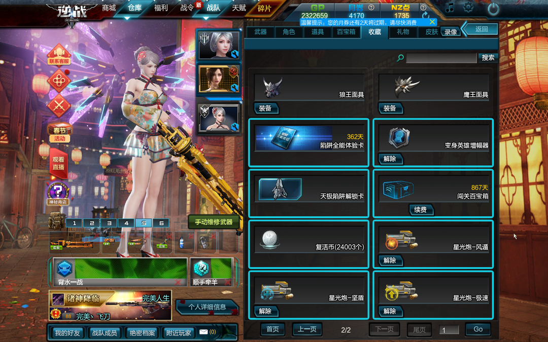 装备描述:四僚机天启套丨诸神套丨魔化魔鲲套丨创世套丨天神套丨光影世纪丨纪元之辰丨甜心爆米花丨吉兆爆米花丨飓风之神-火星丨泰坦双星丨灭世者丨地狱修罗丨炼狱蝎王丨精绝兽神丨火神炎帝丨幽冥毒皇丨世代之影丨原子力量-战星河丨极寒冰神丨纪元之光-------武士之魂丨饕餮丨鲲灵丨麋鹿战车丨圣诞动天使丨麋鹿丨动天使丨创世霸王龙丨地狱烈焰犬丨星云战车丨血魄之戒丨寒天之怒丨天使之泪丨盘龙指环-------塔防全装:塔防陷阱全能体验卡360天丨女英雄丽塔丨变身英雄丨变身英雄增幅器丨变身女英雄丨战场兄弟丨所有陷阱分支丨天极丨天网丨天启-紫玉丨破坏者丨自修磁暴塔丨过载丨星光炮-风遁丨坚盾丨极速丨三级百宝箱------虎王套丨狼王套丨鹰王套丨龙皇套丨猴年套丨百鸟套丨狗年套丨猪年套丨天蓬丨哮天犬狙月丨天王丨海王丨冥王丨ar15-武神丨小猪步枪丨炽鬼-雪风丨混沌-蓝电丨m95-飞电丨msr离子对撞丨ak核子裂变丨m4a1龙皇丨scar棘龙丨an94纪念版丨scar星尘丨赤炎爆弹丨星光闪耀丨彩云遮月 星云战车血魄之戒 万有引力湮灭之核 狼王套鹰王套猪年 诸神黄昏猪年手枪