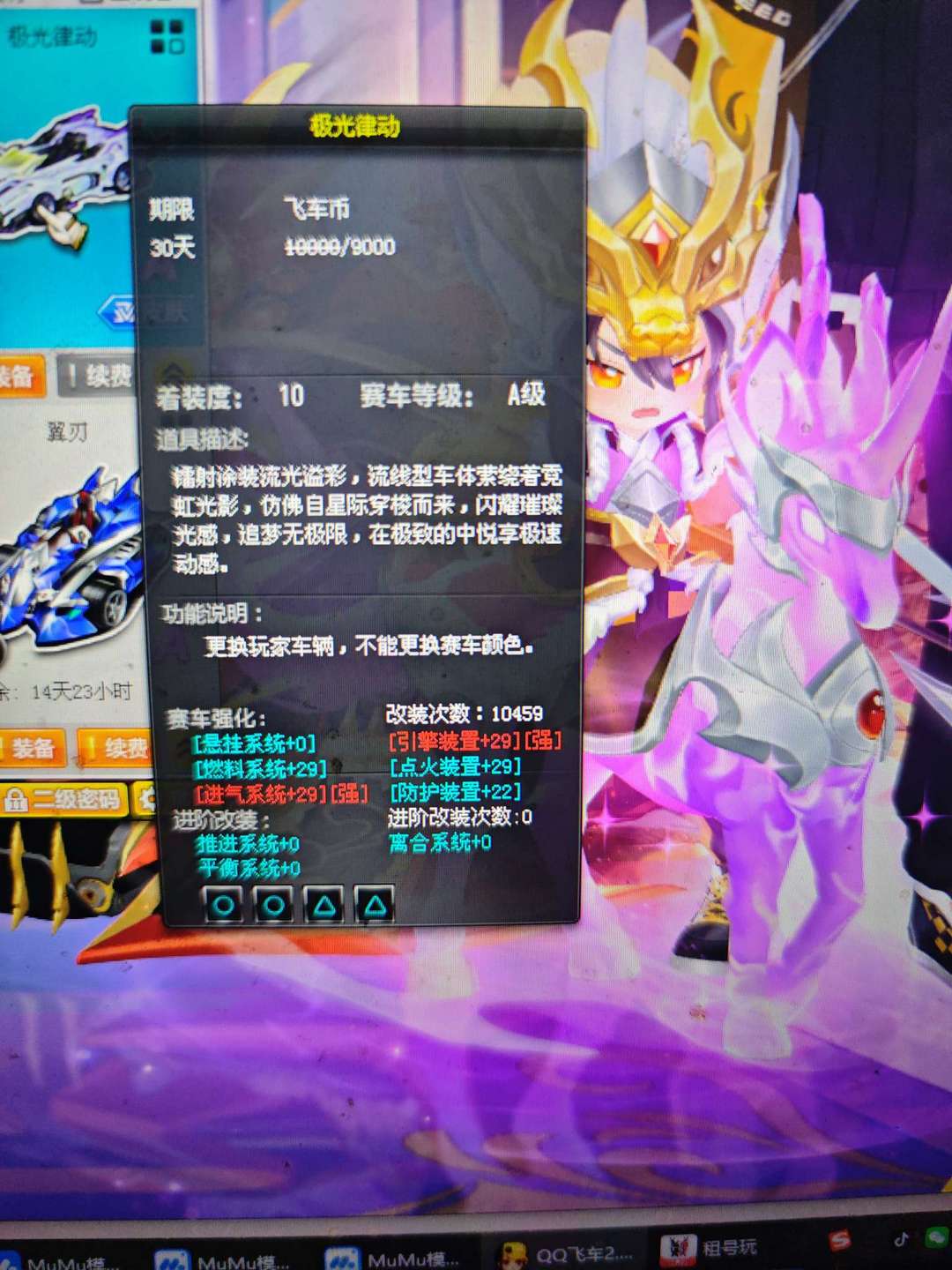 装备描述:全29终极爆天甲逍遥 极光律动 雷诺 小马超+7 A车都是满改加高改的