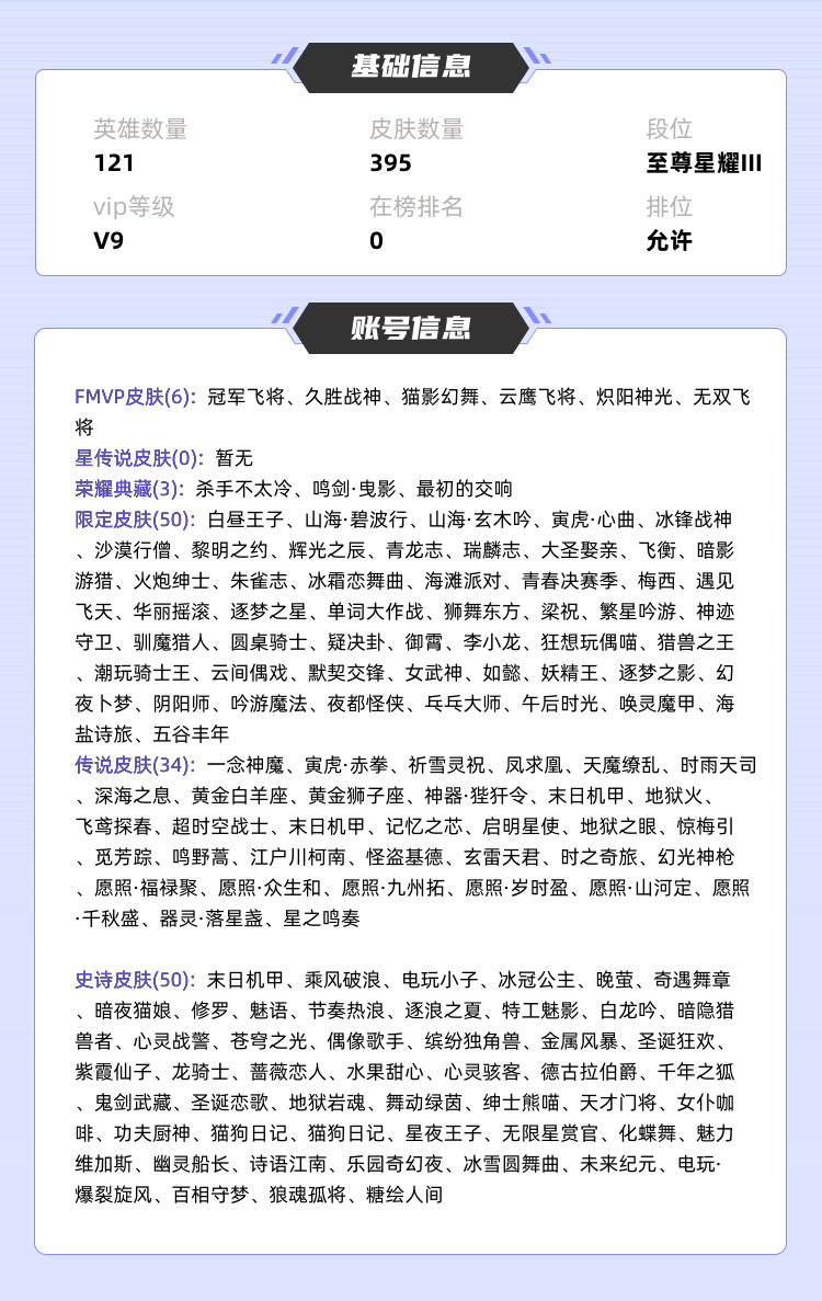 装备描述:>>>>>>毁号,涉及毁坏虚拟财产罪及计算机安全罪,请文明游戏素质游戏,让我们共建美好租号平台>>>>>> 本游戏账号: V9用户,基础段位:至尊星耀III,英雄多,皮肤多。典藏皮肤3个,感受典藏皮肤带来的优质体验快感,FMVP皮肤6个,尽情享受FMVP皮肤带来的主角光环, 私人所属英雄皮肤有:伽罗 最初的交响||李白 鸣剑·曳影||孙尚香 杀手不太冷艾琳 觅芳踪||嬴政 玄雷天君||公孙离 记忆之芯||宫本武藏 惊梅引||张良 黄金白羊座||杨玉环 星之鸣奏||孙策 时之奇旅||嫦娥 器灵·落星盏||云缨 幻光神枪||蔡文姬 愿照·福禄聚||妲己 愿照·众生和||虞姬 愿照·岁时盈||女娲 愿照·千秋盛||司空震 愿照·山河定||澜 愿照·九州拓||桑启 鸣野蒿||鲁班七号 江户川柯南||马可波罗 怪盗基德||诸葛亮 时雨天司||狄仁杰 神器·狴犴令||孙尚香 末日机甲||李元芳 飞鸢探春||马可波罗 深海之息||孙策 末日机甲||裴擒虎 寅虎·赤拳||达摩 黄金狮子座||公孙离 祈雪灵祝||狄仁杰 超时空战士||虞姬 启明星使||李信 一念神魔||吕布 天魔缭乱||李白 凤求凰||