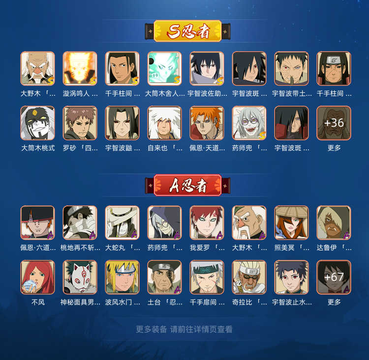 装备描述:50s-须佐卡卡西-绯流蝎须佐止水-忍战雷影-三代风影3100W团本车头341个忍者45魅力-多个98通灵