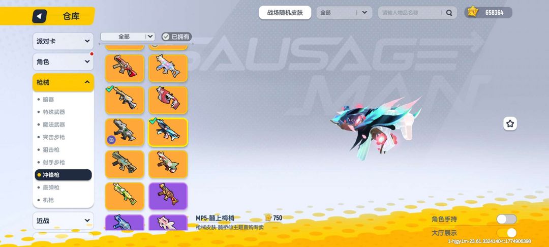 装备描述:几把升级枪大概。然后几个车皮有ump9 加速机枪 还有几梦幻加菲猫背包和新的妹控。还有几个车皮。